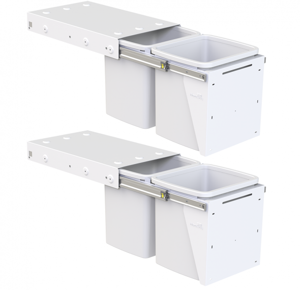2 x KC30SCD Bins stacked in one cabinet to create a 4 bucket waste and recycling solution. The 2 units can fit within a 720mm cabinet height, allowing a 16mm shelf between units - see dimensioned image.