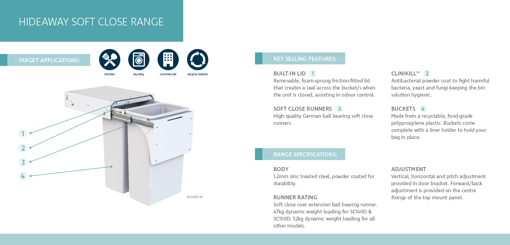 The smooth closing action of soft-close runners is increasingly popular in drawer systems, and is available on the Concelo, Hideaway Soft Close and Hideaway Compact ranges of bins.