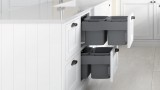 2 x CR350-213D-C Bins stacked in one cabinet to create a 4 bucket waste and recycling solution. The 2 units can fit within a 720mm cabinet height, allowing a 16mm shelf between units. Waste & organics/food scraps can fit in the top 2 bins, recycling can be separated in the lower 2 bins. 52L total storage, in a 350mm wide cabinet.