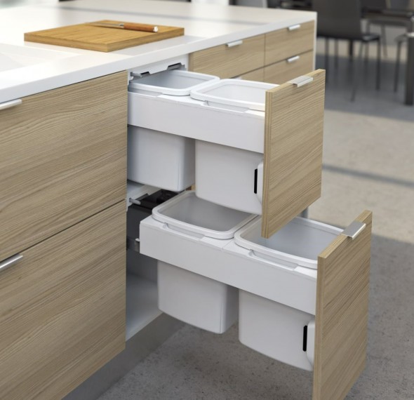 2 x CR350-213D-W Bins stacked in one cabinet to create a 4 bucket waste and recycling solution. The 2 units can fit within a 720mm cabinet height, allowing a 16mm shelf between units. Waste & organics/food scraps can fit in the top 2 bins, recycling can be separated in the lower 2 bins. 52L total storage, in a 350mm wide cabinet.
