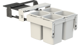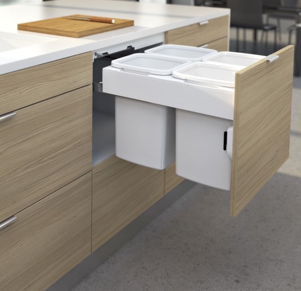 • Active Lid — Hidden from sight at the top of the bin inside the cabinet and drops down to close over the two left hand buckets when the bin is closed. The motion of the lid is synchronised with the opening and closing action of the bin, which lets you keep your hands free to simply drop waste into the bin.